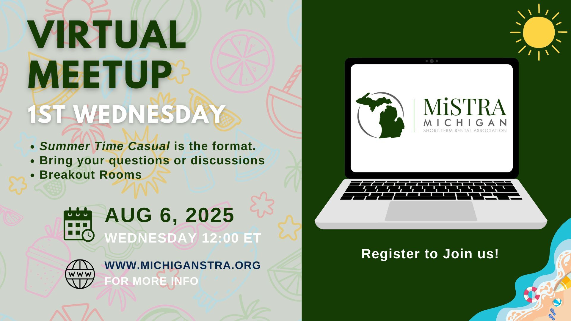 Grab your favorite summertime drink and hop on Zoom to connect with fellow short-term rental hosts and managers! This will be an informal, open-format meetup—bring your questions, discussion topics, or just come to listen and share.